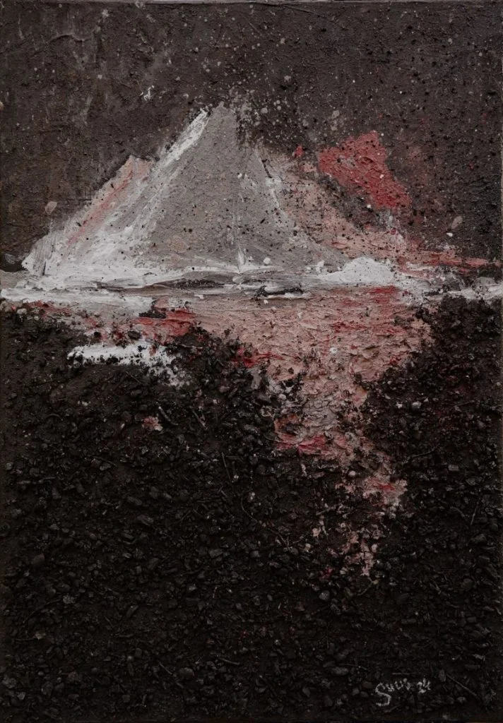Er kreiert Materialdrucke und Materialgemälde aus Recyclingpapier, Sand, Ton, Holzmehl sowie Pflanzen- und Tierresten. Er stellt die Folgen des Klimawandels und die durch unser eigenes Handeln verursachten Umweltungleichgewichte dar.