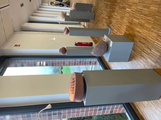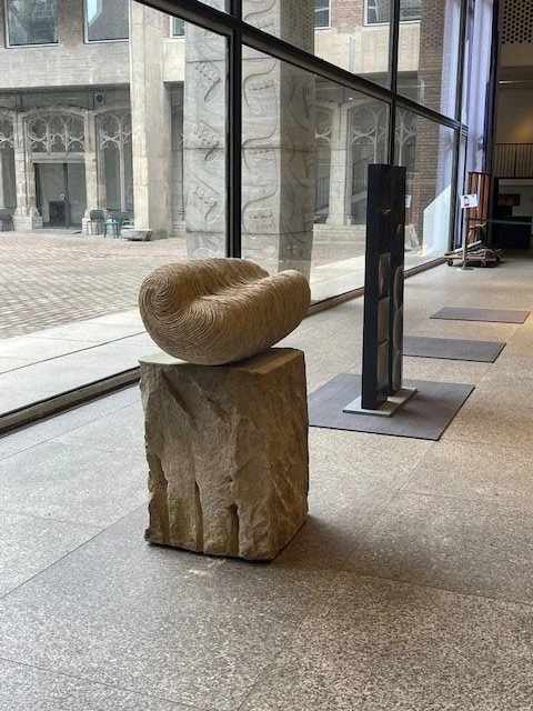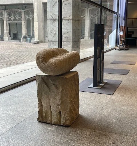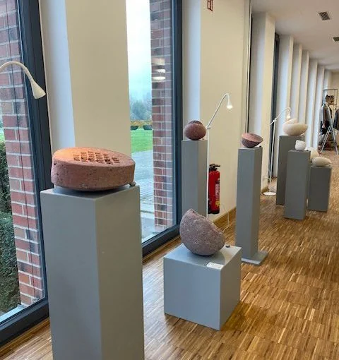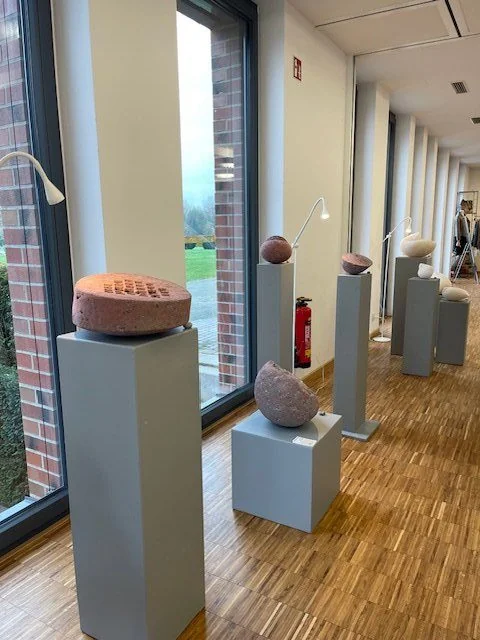 Gastgeberin und Präsentation skulpturaler Arbeiten aus Stein – Gastvrouw die haar beeldhouwwerken van steen presenteert.